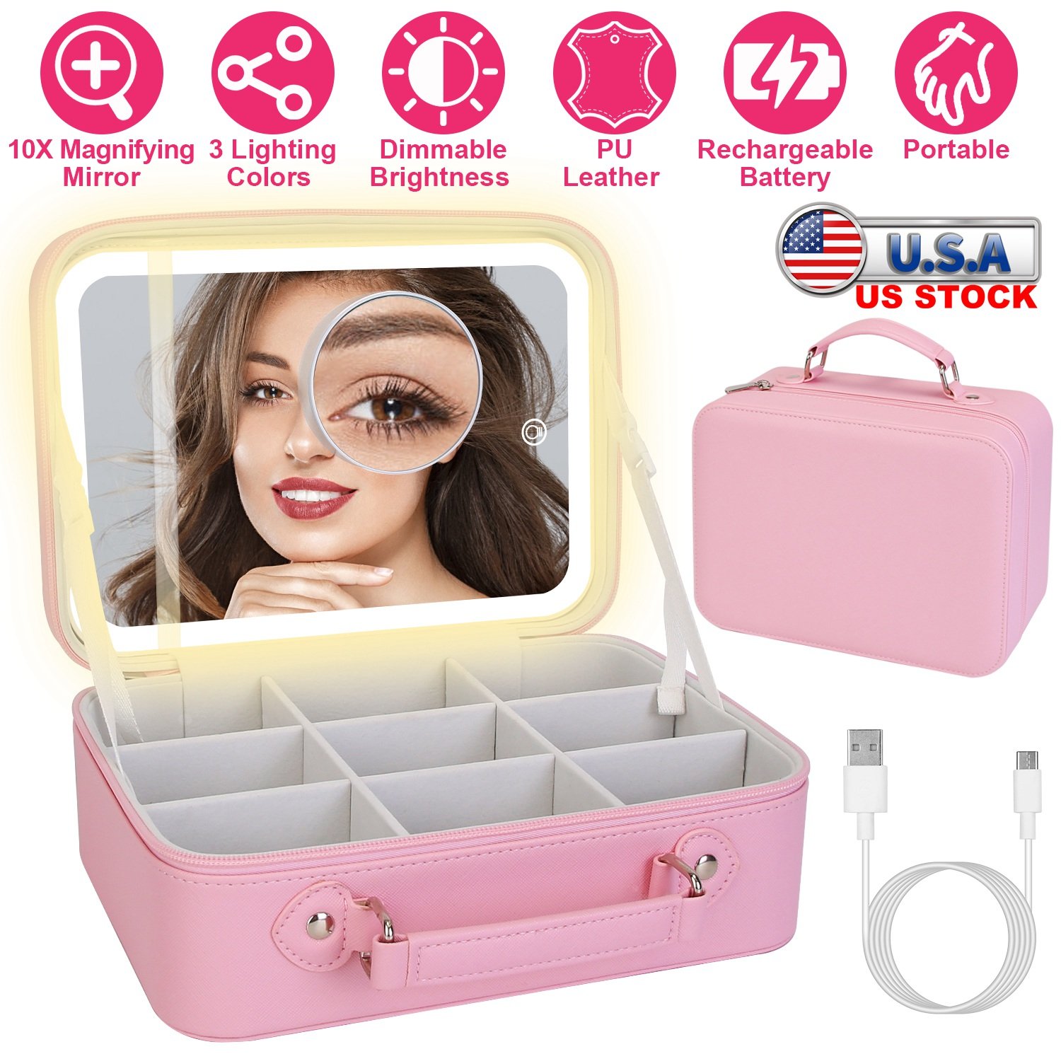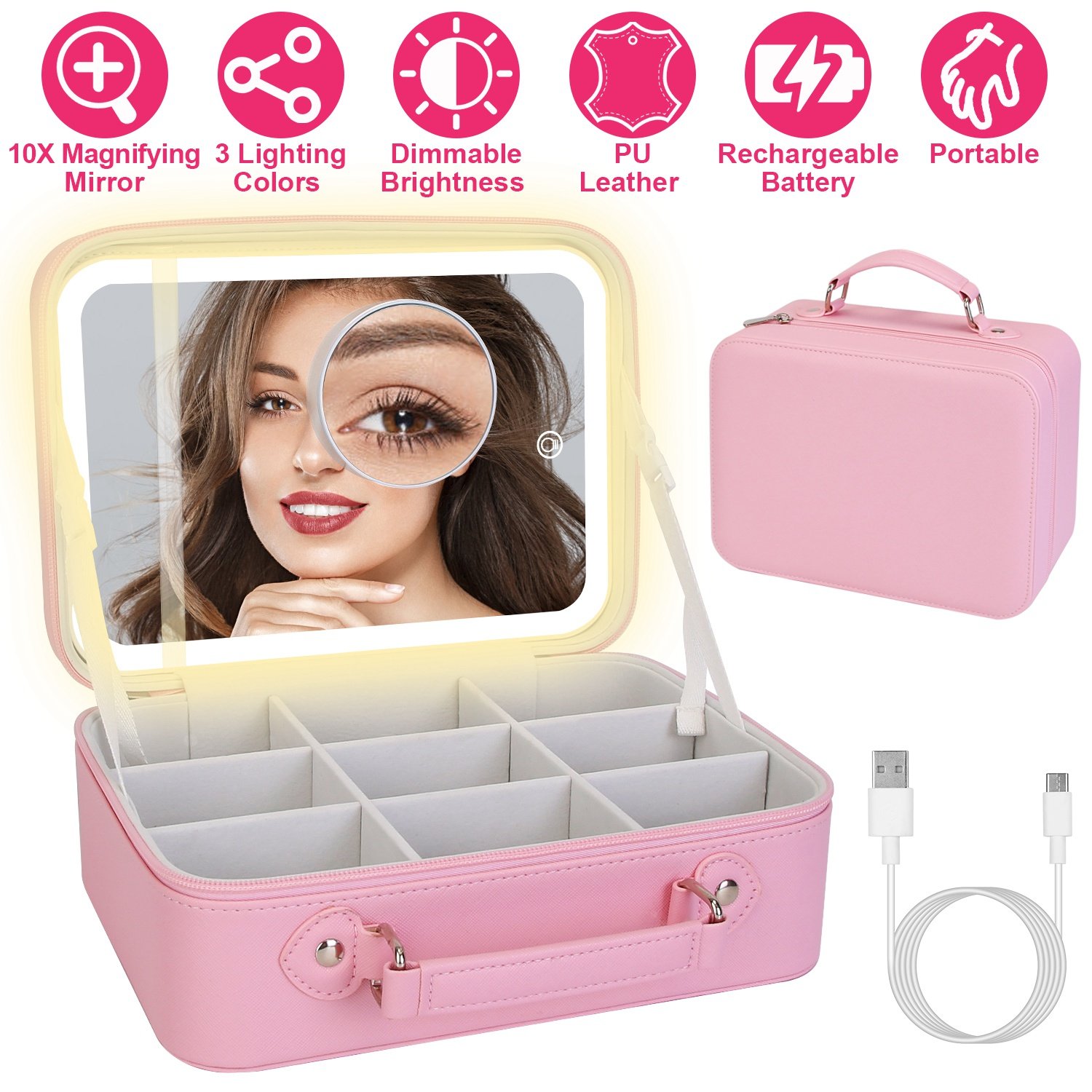 Travel Makeup Bag With 3 Light Colors Dimmable Brightness LED Mirror Detachable 10X Magnifying Mirror Adjustable Dividers Portable Waterproof Cosmetic